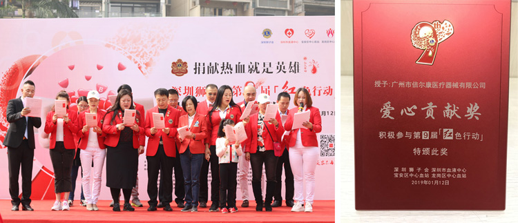 2019年1月12日,聯(lián)手深圳獅子會(huì)在深圳龍華區(qū)民治春華四季園舉行了第九屆“紅色行動(dòng)”給每一位成功獻(xiàn)血的朋友送出倍爾康額溫計(jì),并榮獲了“愛(ài)心貢獻(xiàn)獎(jiǎng)”。