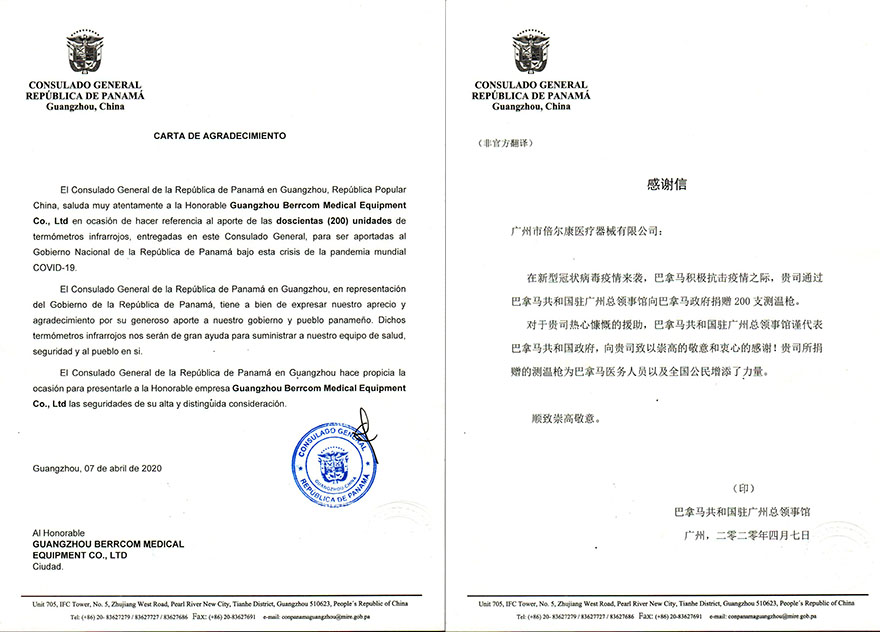 信中提到,倍爾康捐贈(zèng)的非接觸式紅外體溫計(jì)將為巴拿馬醫(yī)務(wù)人員及全國(guó)公民增添力量。