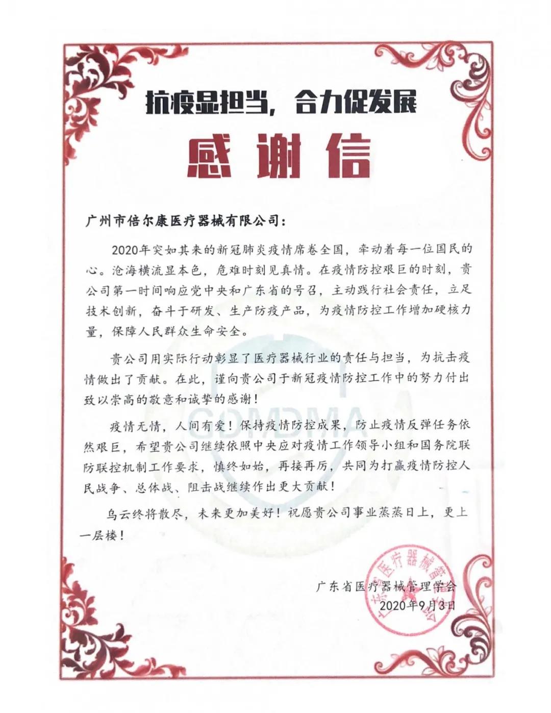 在現(xiàn)場,倍爾康收到了廣東省醫(yī)療器械管理學(xué)會的感謝信——對倍爾康在疫情期間加班加點(diǎn)保質(zhì)量促生產(chǎn),發(fā)揚(yáng)廣東省醫(yī)療器械大愛無疆的奉獻(xiàn)精神,助力一線防控表示感謝!