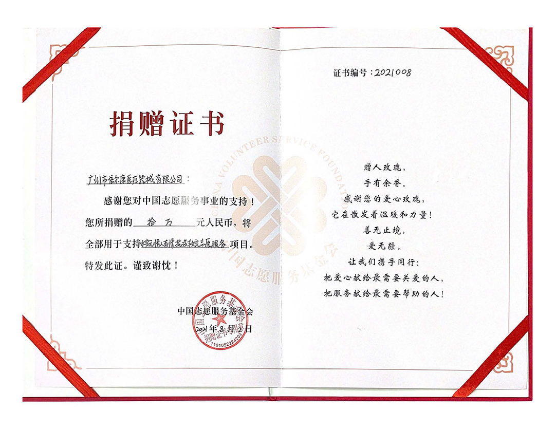 中國(guó)志愿服務(wù)基金會(huì)頒發(fā)的捐贈(zèng)證書
