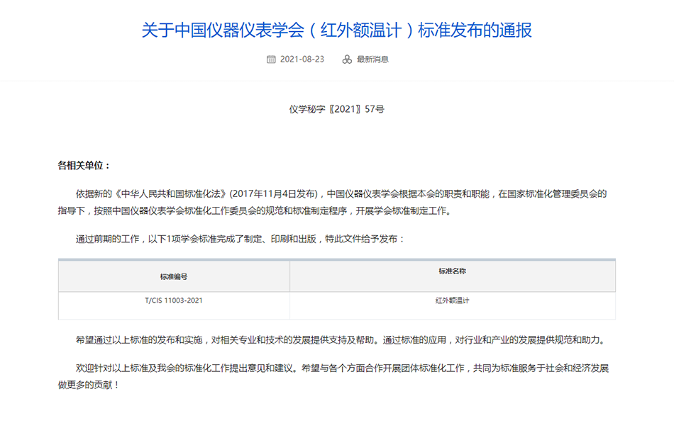 2021年8月20日,中國儀器儀表學(xué)會(huì)對(duì)外宣布,依據(jù)新的《中華人民共和國標(biāo)準(zhǔn)化法》(2017年11月4日發(fā)布),中國儀器儀表學(xué)會(huì)根據(jù)本會(huì)的職責(zé)和職能,在國家標(biāo)準(zhǔn)化管理委員會(huì)的指導(dǎo)下,按照中國儀器儀表學(xué)會(huì)標(biāo)準(zhǔn)化工作委員會(huì)的規(guī)范和標(biāo)準(zhǔn)制定程序,開展學(xué)會(huì)標(biāo)準(zhǔn)制定工作,通過前期的工作完成了制定、印刷和出版,現(xiàn)發(fā)布《紅外額溫計(jì)標(biāo)準(zhǔn)》。