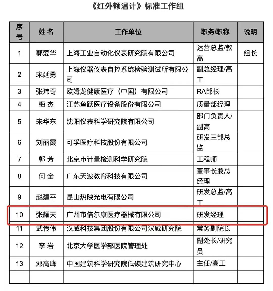 在2020年4月份,中國儀器儀表學(xué)會(huì)為滿足市場(chǎng)的需要,規(guī)范產(chǎn)品的技術(shù)要求、測(cè)量準(zhǔn)確度、可靠性等質(zhì)量要求,規(guī)范一致的試驗(yàn)方法,用標(biāo)準(zhǔn)促進(jìn)紅外額溫計(jì)產(chǎn)品在整體質(zhì)量和性能上的全面提升等成立了紅外額溫計(jì)標(biāo)準(zhǔn)制定工作組,倍爾康的研發(fā)經(jīng)理張耀天作為行業(yè)代表參與了這項(xiàng)工作。