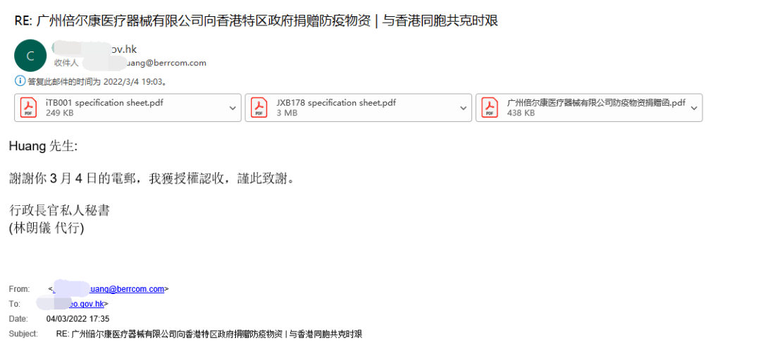 3月4日,倍爾康捐贈(zèng)抗疫物資發(fā)出后,我們收到了來(lái)自香港行政長(zhǎng)官秘書(shū)的致謝函。