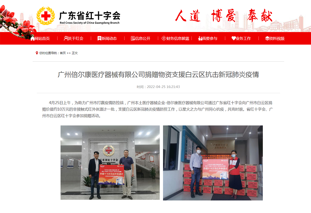 廣東省紅十字會也在其官網(wǎng)報道了倍爾康捐贈體溫計的消息,并感謝倍爾康的愛心捐贈以及高度肯定了倍爾康的社會責任感。