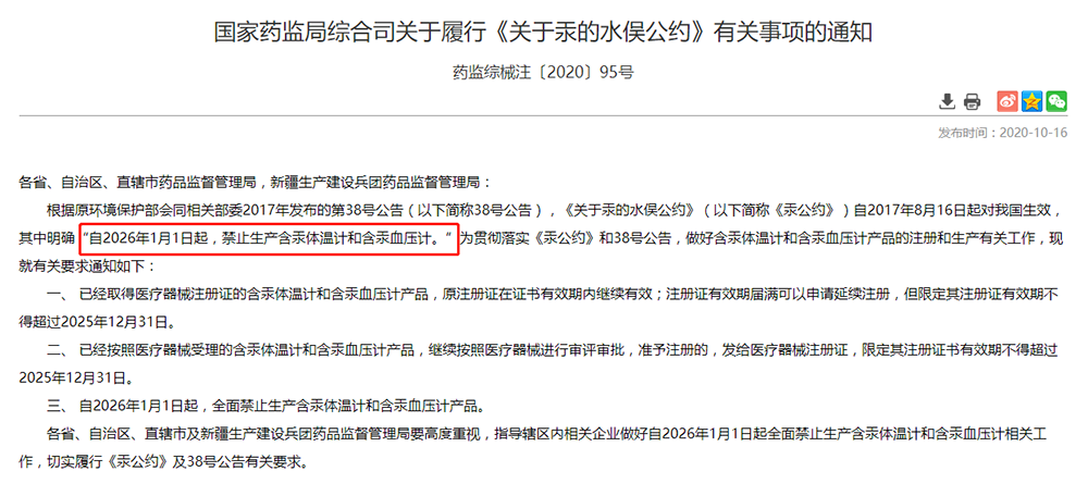 《國(guó)家藥監(jiān)局綜合司關(guān)于履行(關(guān)于汞的水俁公約)有關(guān)事項(xiàng)的通知》里明確要求:自2026年1月1日起,我國(guó)將全面禁止生產(chǎn)含汞體溫計(jì)和含汞血壓計(jì)產(chǎn)品。